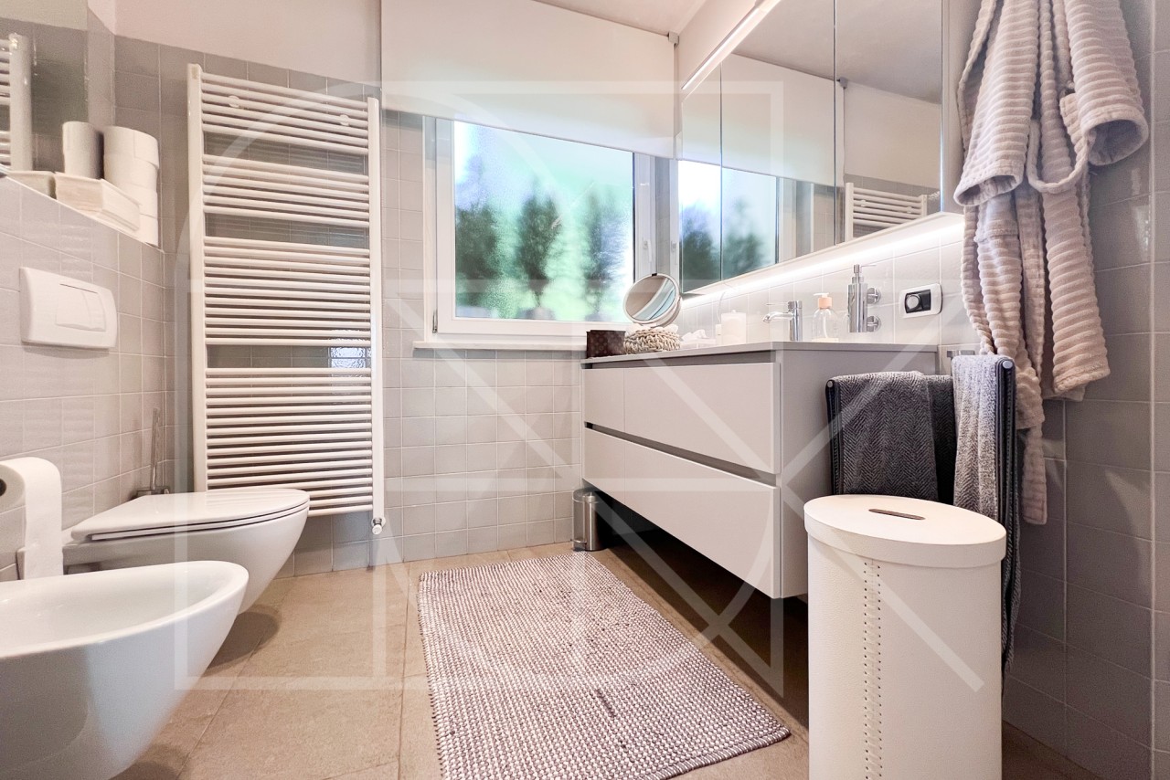 Das Badezimmer ist modern gestaltet und bietet eine entspannte Atmosphäre für Ihre tägliche Routine.