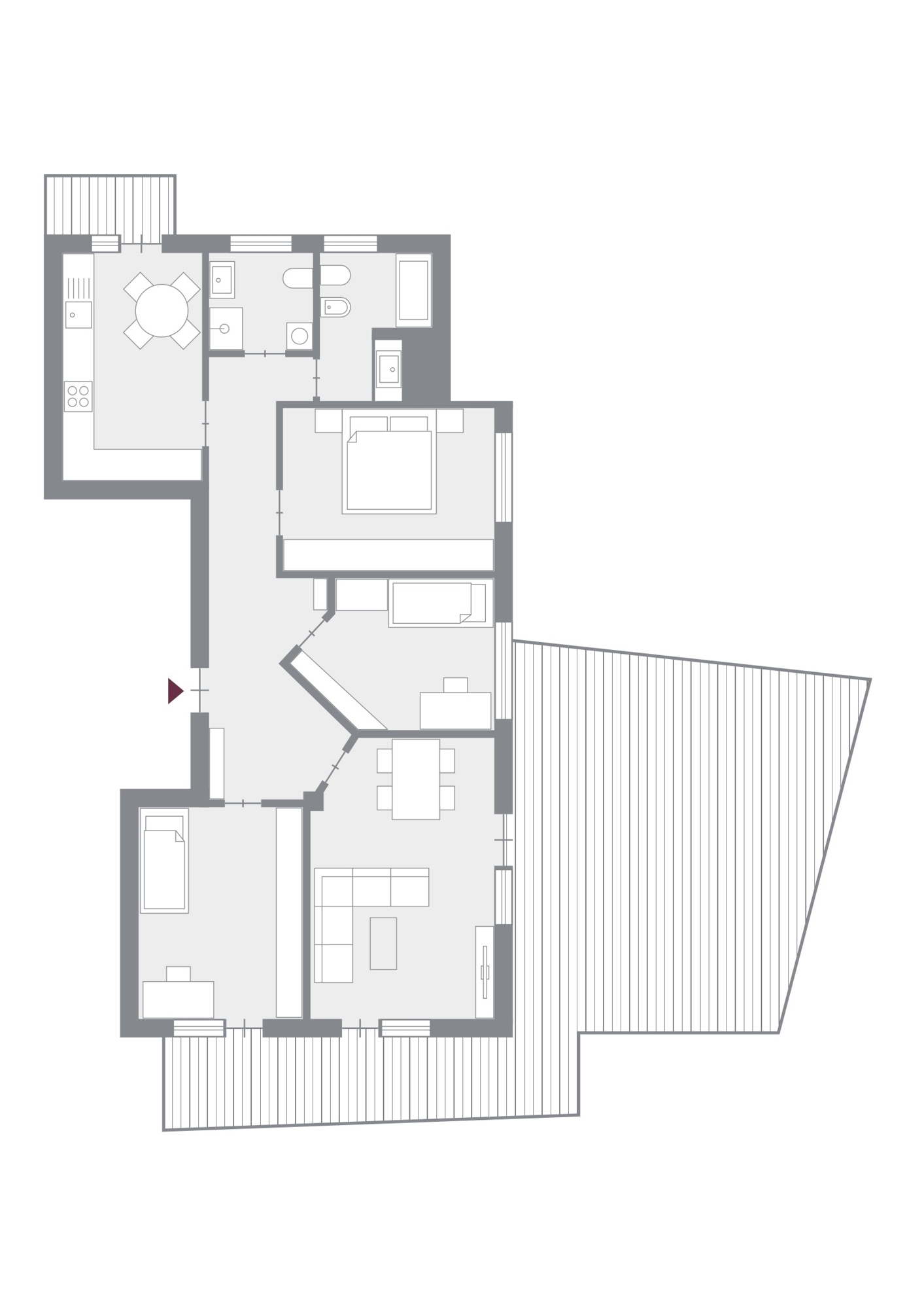 Das Herzstück der Wohnung ist das helle, geräumige Wohnzimmer mit direktem Zugang auf die nach Südwesten ausgerichtete Panoramaterrasse: ein sonnenverwöhnter Rückzugsort mit viel Platz für Lounge- und Essbereiche – urbanes Outdoor-Wohnen auf höchstem Niveau.