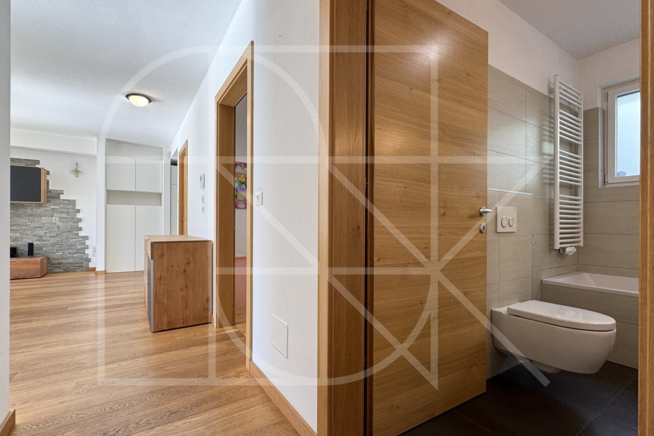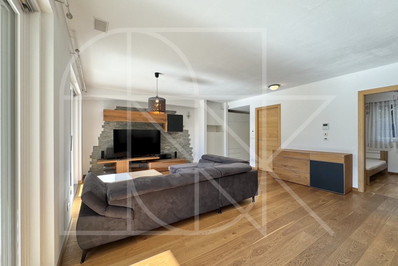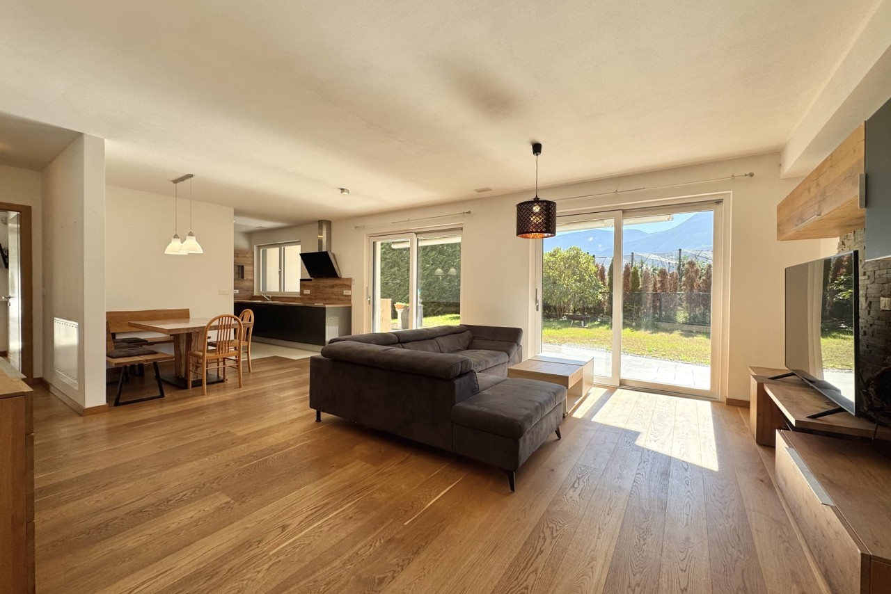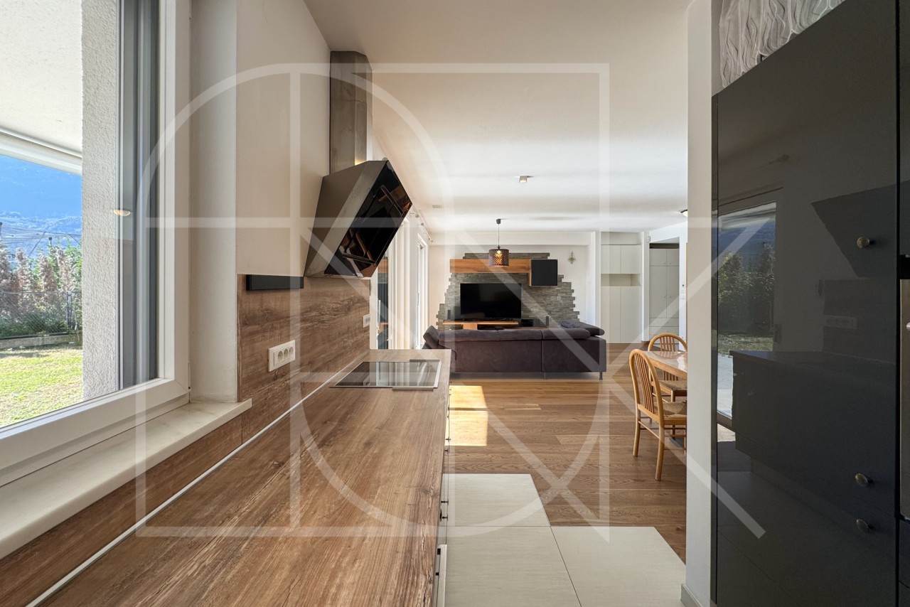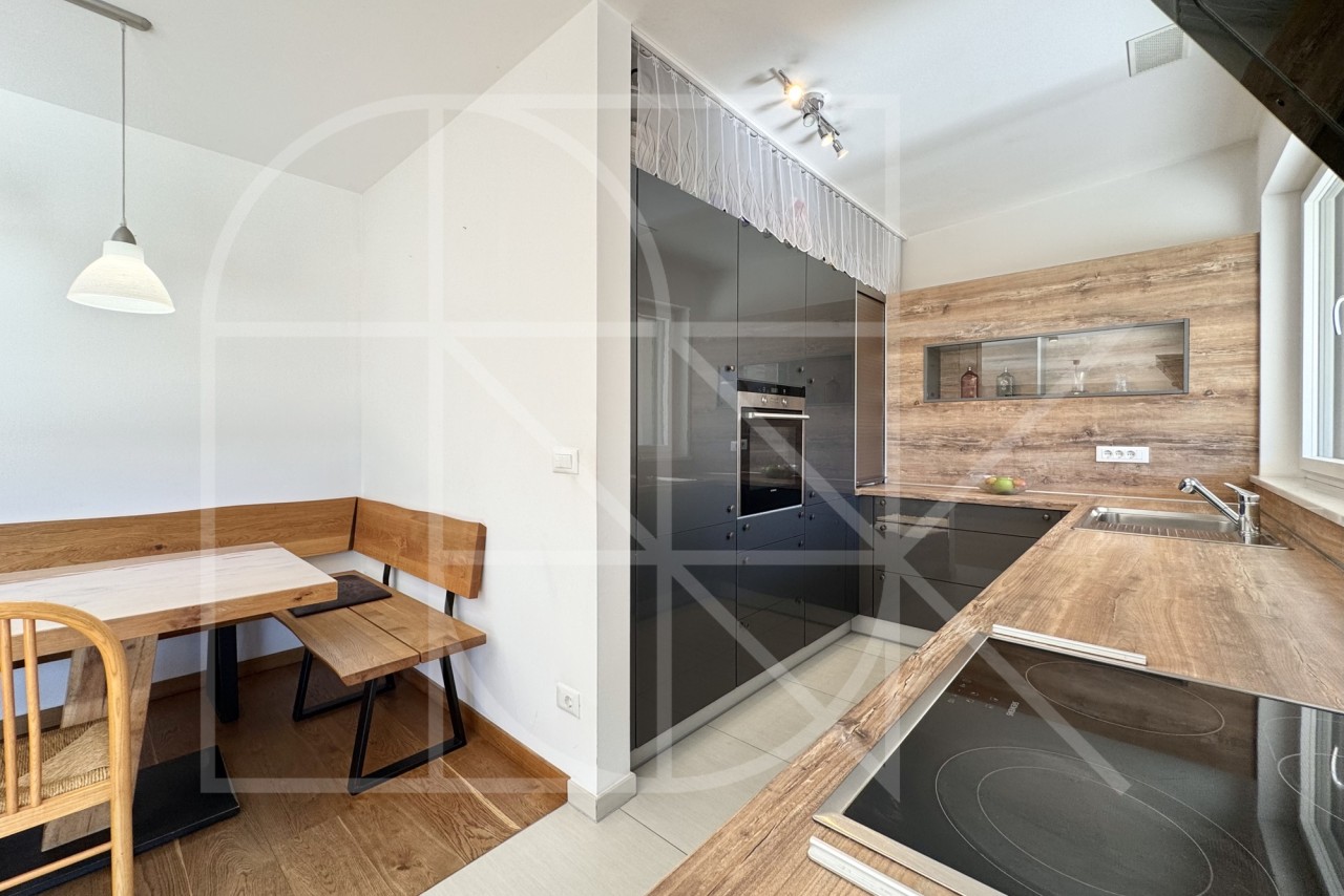 Das Herzstück der Wohnung ist zweifellos der sehr helle und großzügige Wohnbereich mit offener und qualitativer Einbauküche. Der elegante Vollholzfußboden, sorgt im Wohnzimmer für eine besonders warme und behagliche Atmosphäre.