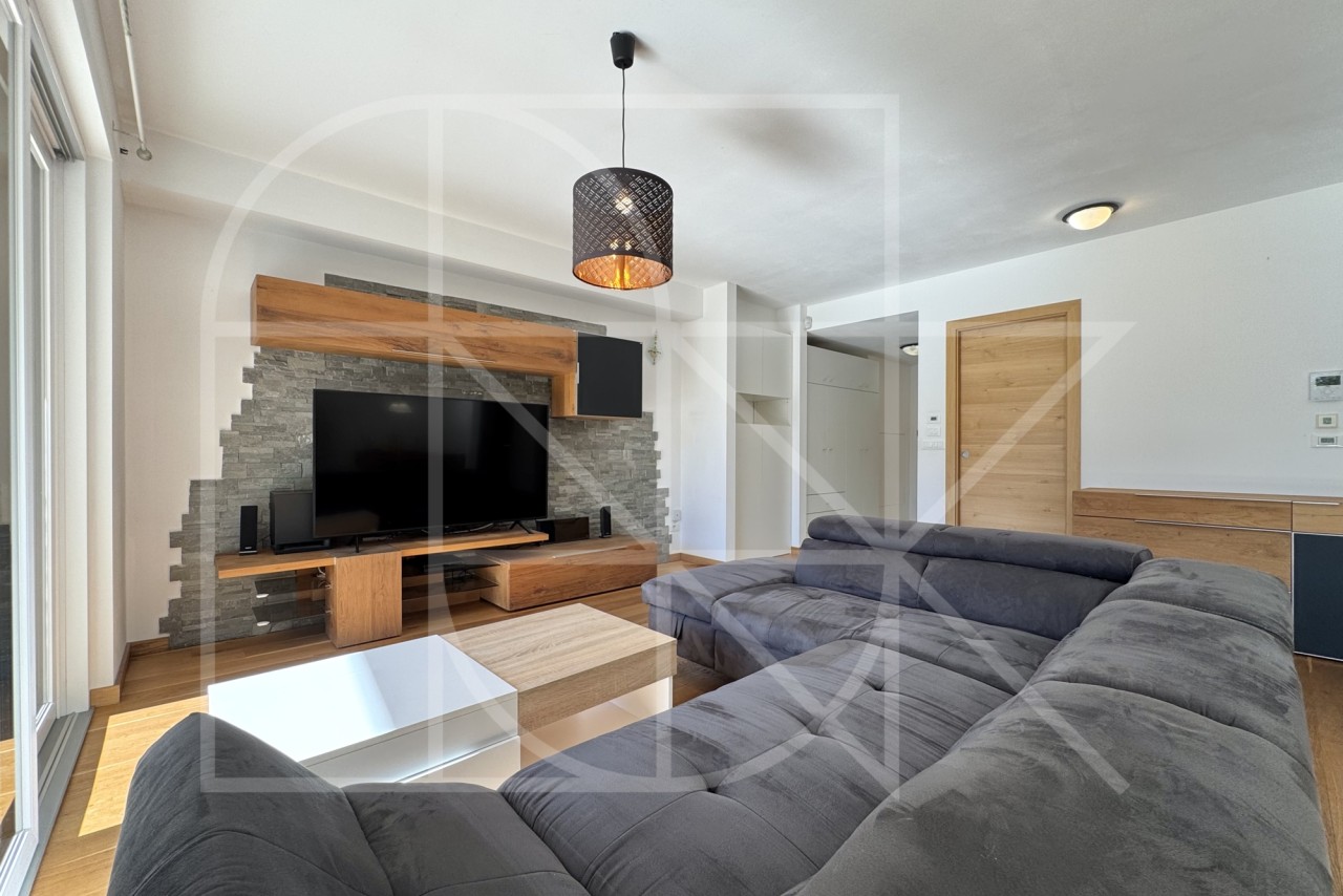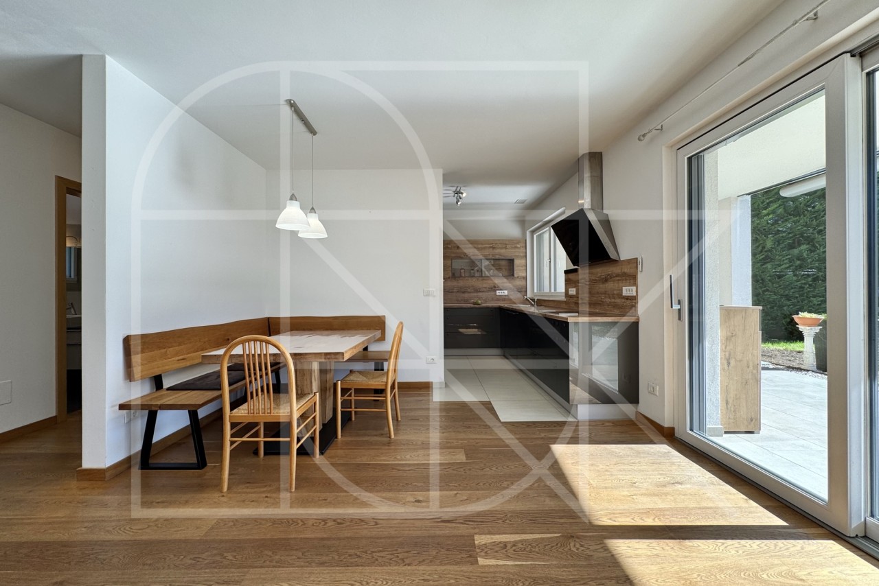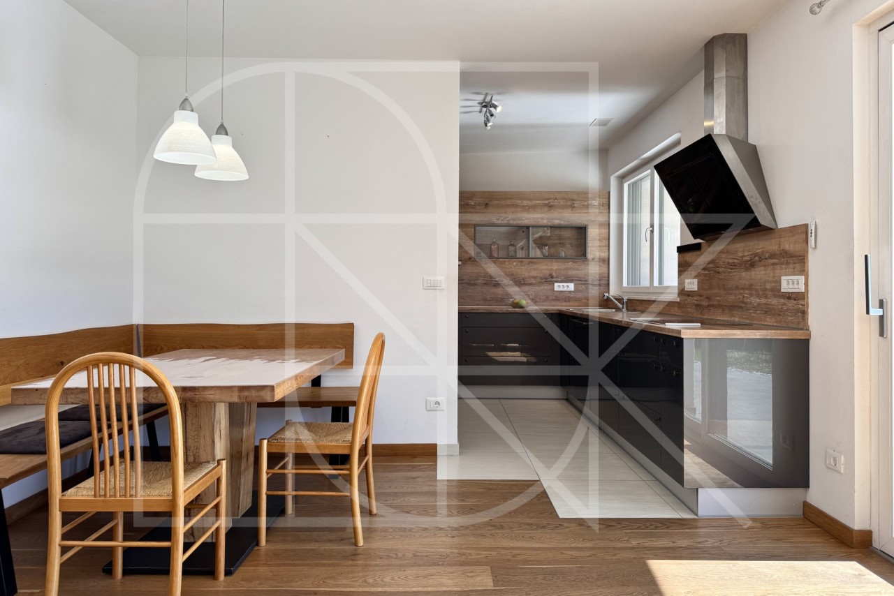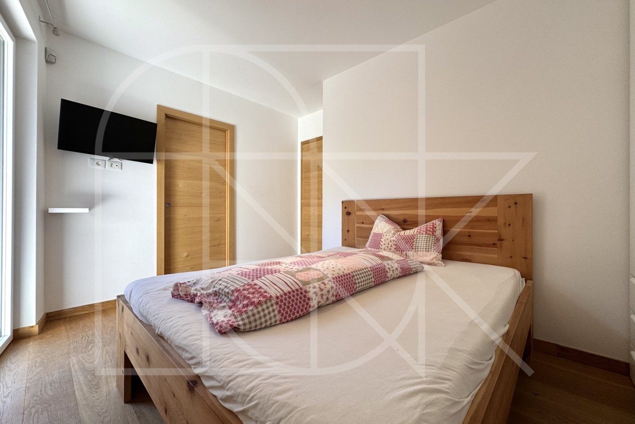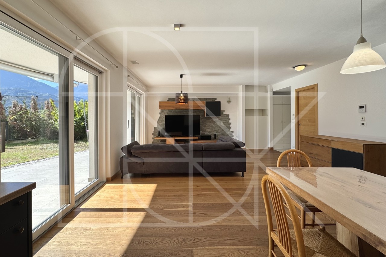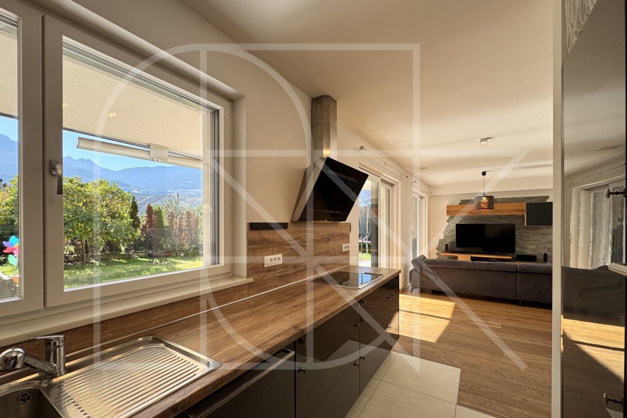 Das Herzstück der Wohnung ist zweifellos der sehr helle und großzügige Wohnbereich mit offener und qualitativer Einbauküche. Der elegante Vollholzfußboden, sorgt im Wohnzimmer für eine besonders warme und behagliche Atmosphäre.