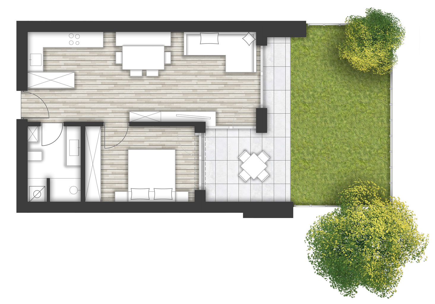 L'appartmento 05 é un bilocale situato al piano terra e composto da: ingresso, soggiorno con cucina, camera da letto, bagno, errazza, giardino e cantina. Dietro il pagamento di un corrispettivo l'appartamento può essere svincolato dal vincolo "alloggio per residenti". Tutte le informazioni sono da considerarsi indicative e potrebbero essere soggette a variazioni.