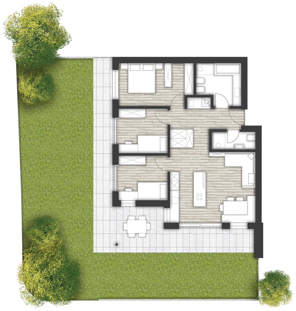 L'appartmento 03 é un quadrilocale situato al piano terra e composto da: ingresso, soggiorno con cucina, 3 camere da letto, 2 bagni, terrazza, giardino e cantina. Dietro il pagamento di un corrispettivo l'appartamento può essere svincolato dal vincolo "alloggio per residenti". Tutte le informazioni sono da considerarsi indicative e potrebbero essere soggette a variazioni.