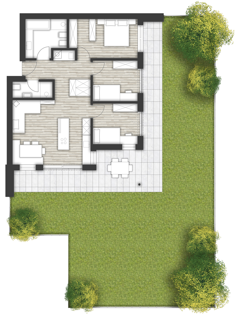 L'appartmento 04 é un quadrilocale situato al piano terra e composto da: ingresso, soggiorno con cucina, 3 camere da letto, 2 bagni, terrazza, giardino e cantina. Dietro il pagamento di un corrispettivo l'appartamento può essere svincolato dal vincolo "alloggio per residenti". Tutte le informazioni sono da considerarsi indicative e potrebbero essere soggette a variazioni.