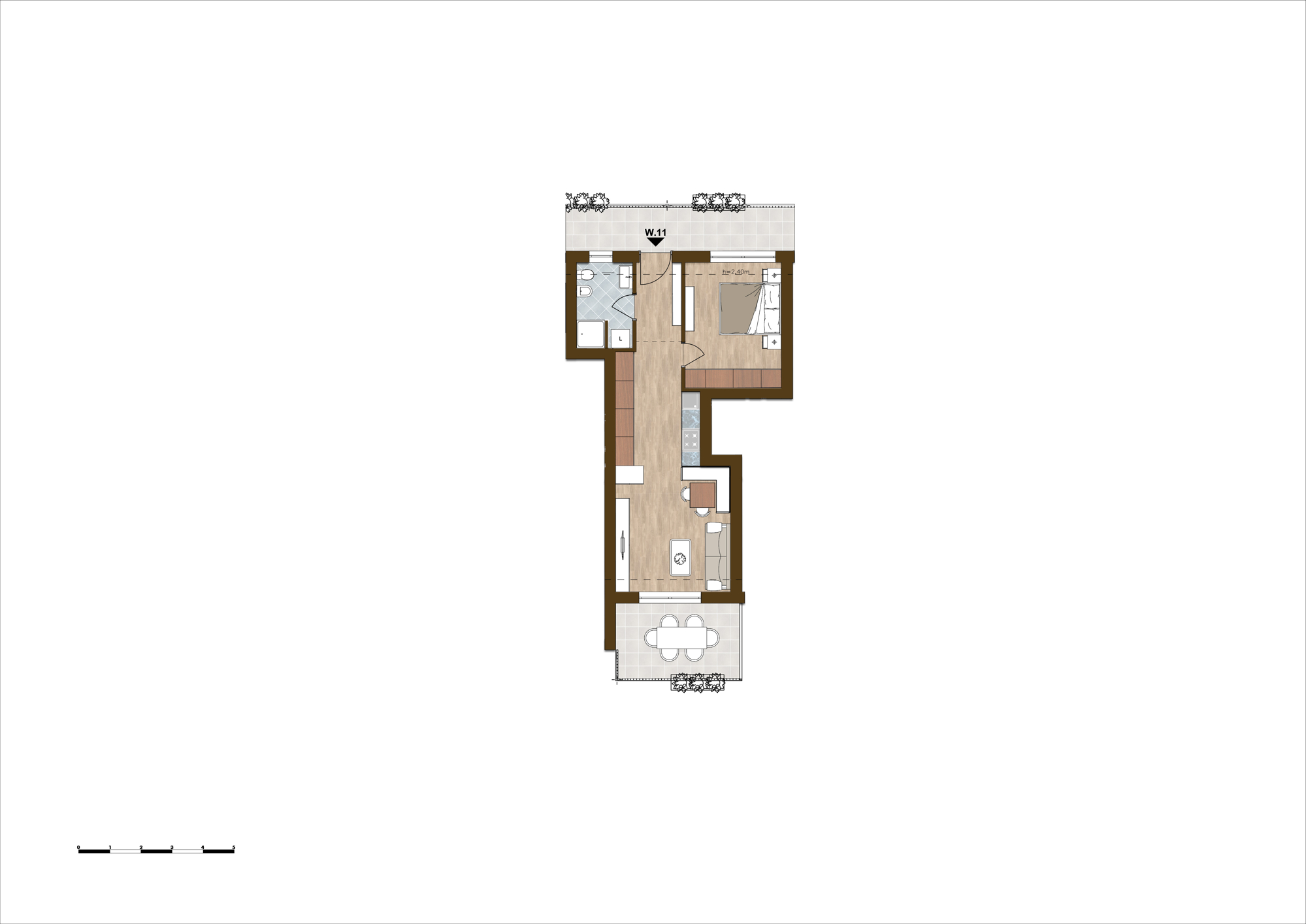 L'appartmento 11 é un bilocale situato al secondo piano composto da: ingresso, soggiorno con cucina, camera da letto, bagno, terrazza e cantina. Dietro il pagamento di un corrispettivo l'appartamento può essere svincolato dal vincolo "alloggio per residenti".